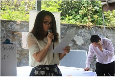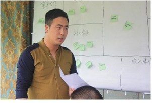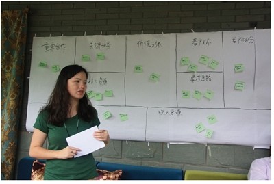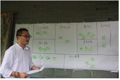 (圖為中國(guó)第一旅行女裝――綻放品牌創(chuàng)始人安麗(“茉莉”女士)按照曹老師提出的九步商業(yè)模式對(duì)自家企業(yè)進(jìn)行分析講解,并提出自身公司存在的優(yōu)勢(shì)與問題)