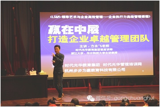 課程開始之初,方老師首先提出當(dāng)代我國企業(yè)的斷層時(shí)代全面到來。包括人文、能源、人才、干部、管理、教育等在內(nèi)的各方面都在信息高速發(fā)達(dá)的社會(huì)即將或正在面臨斷層,老板拼命學(xué)習(xí)提升,管理層在那原地踏步,你有再好的想法、點(diǎn)子,沒有好的中層一樣難以執(zhí)行,這是現(xiàn)在中小企業(yè)的通病。接著方永飛老師延續(xù)其一貫的詼諧幽默的講課風(fēng)格,通過幾個(gè)淺顯易懂的例子引出課程主題:企業(yè)的成功不僅取決于高層,中層管理者是企業(yè)的脊梁,企業(yè)的可持續(xù)發(fā)展的關(guān)鍵,80%來自企業(yè)中層的作用。企業(yè)決勝未來,一定要贏在中層!