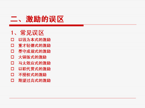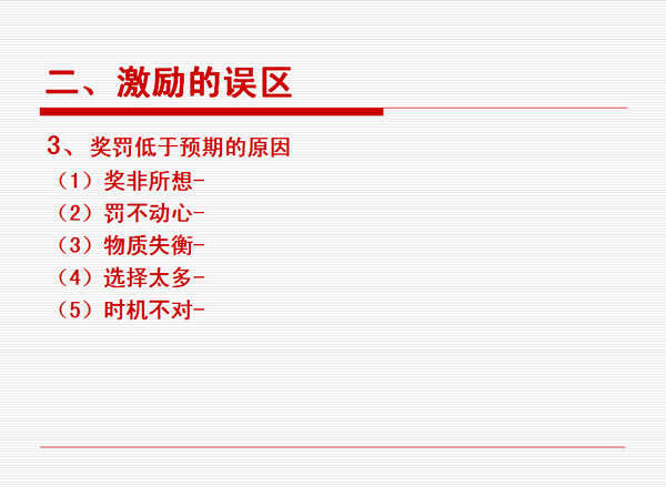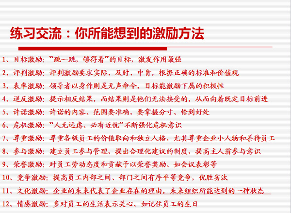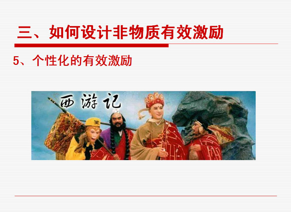 非物質(zhì)有效激勵很多人的第一反應(yīng)是不花錢,實際上世界上不花錢的東西是不存在的。而花同樣的錢辦不同的事,這是可以存在的。拿同樣的錢去產(chǎn)生不同的效益,這才是我們管理者應(yīng)該去思考的問題。