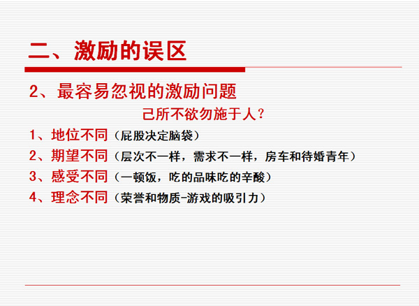 期望過高式的激勵——個人訴求不一樣的時候就必須考慮為什么己所不欲勿施于人。
