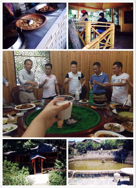 我們自駕驅車到達麗水當?shù)兀瑫T浙江天喜網(wǎng)絡科技有限公司總經(jīng)理李欣駿早已在具有當?shù)靥厣?“潛溪山莊”為游學共軍一行備好午餐?!按簛肀闶翘一ㄋ?,不辨仙源何處尋”,小編被這下車后的麗水美景所震驚。