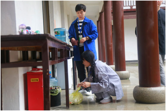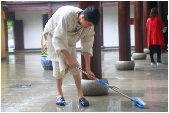 每日早齋過后,禪商班的全體學(xué)員們都進(jìn)行出坡勞作,有的在廚房洗菜,有的在寺廟走廊掃地,還有打掃禪房、齋堂、五觀堂等等各有所執(zhí),寺院內(nèi)外到處都是學(xué)員忙碌的身影。