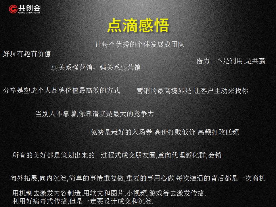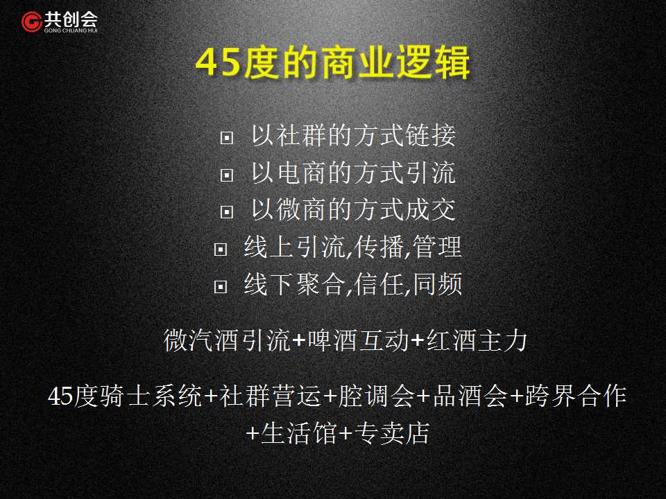 15年傳統(tǒng)電腦批發(fā)生意成功轉(zhuǎn)型社交電商的二次創(chuàng)業(yè),在共創(chuàng)會的平臺上,他學(xué)習(xí)中實(shí)踐,實(shí)踐中成長,見證了45度冰從500萬到2.6億的過程,短短兩年的時(shí)間里,他通過社群營銷思維,開啟了W2W(wide to wide)的探索,1萬個(gè)微信號的自媒體營運(yùn),用5000萬粉絲為紐帶,成為了一個(gè)超級鏈接者!(大拇指!)