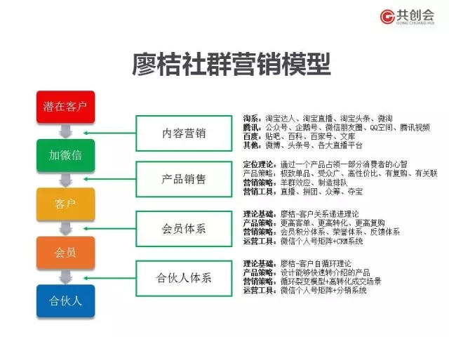 廖總:社群營銷是否只能服務(wù)一些特定企業(yè),這個問題其實不值得深入研究。研究如何賣某個產(chǎn)品不如研究如何挖掘每個人的終身價值和社交價值,如何獲得更多的收益。下圖是我自己建立的一個新的社群營銷模型,首先要通過內(nèi)容營銷來吸引客戶,加上微信;加微信后,在做產(chǎn)品銷售,產(chǎn)品要有高性價比,極致單品,受眾廣;再設(shè)置會員體系,篩選部分客戶成為會員,再進行新一輪的產(chǎn)品營銷;再設(shè)置合伙人體系通過設(shè)置更高的篩選要求,并設(shè)計能夠快速轉(zhuǎn)介紹的產(chǎn)品。