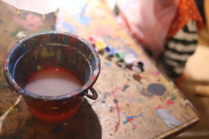 油紙傘DIY現(xiàn)場(chǎng)準(zhǔn)備了空白的油紙傘、調(diào)色盤(pán)、涂料和畫(huà)筆等……