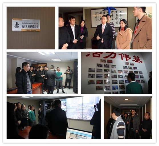 (上圖為虞董帶領(lǐng)大家參觀偉基集團。施工現(xiàn)場視頻監(jiān)控室是一大亮點,設備的先進性、科技的信息化、管理的一體化,以及對安全及進度輕松便捷的管控,都清晰明了地展現(xiàn)在眾人眼前,一目了然。一站式服務中心更是體現(xiàn)出了偉基的人性化,農(nóng)民工兄弟收工下班回來就可以在這里休息,享受五星級的服務標準,這樣的員工關(guān)懷度,套句網(wǎng)絡用語:這可真是高大上的節(jié)奏!)