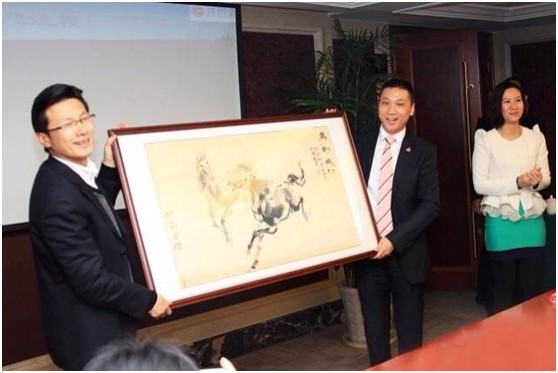 (上圖為方永飛會長代表共創(chuàng)會向偉基贈送了國畫《馬到成功》,借此祝愿偉基在馬年奮蹄揚鞭,再創(chuàng)新輝煌?。?/p>